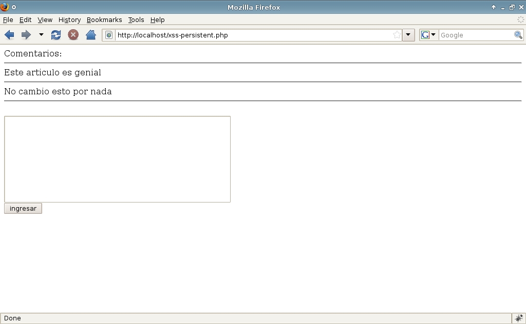 este es el clásico ejemplo del buscador (ja, ya parece nombre de ejemplo de libro de sistemas operativos). Como ven, el usuario no usó ninguna comilla, pero aún así, el código es válido para la mayoría de los browsers. Ahora, el usuario malo, podría ingresar lo siguiente en el campo de búsqueda: "nada onMouseOver=alert(String.fromCharCode(88,83,83))" (sin las comillas). El resultado HTML de la ejecución del código php será: